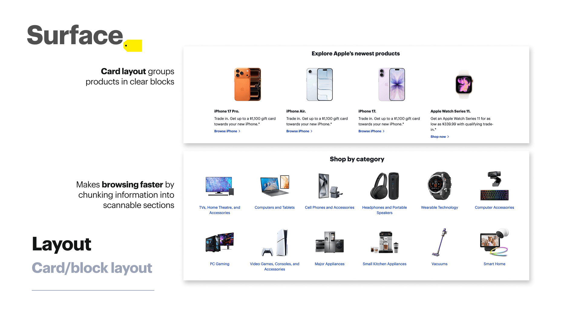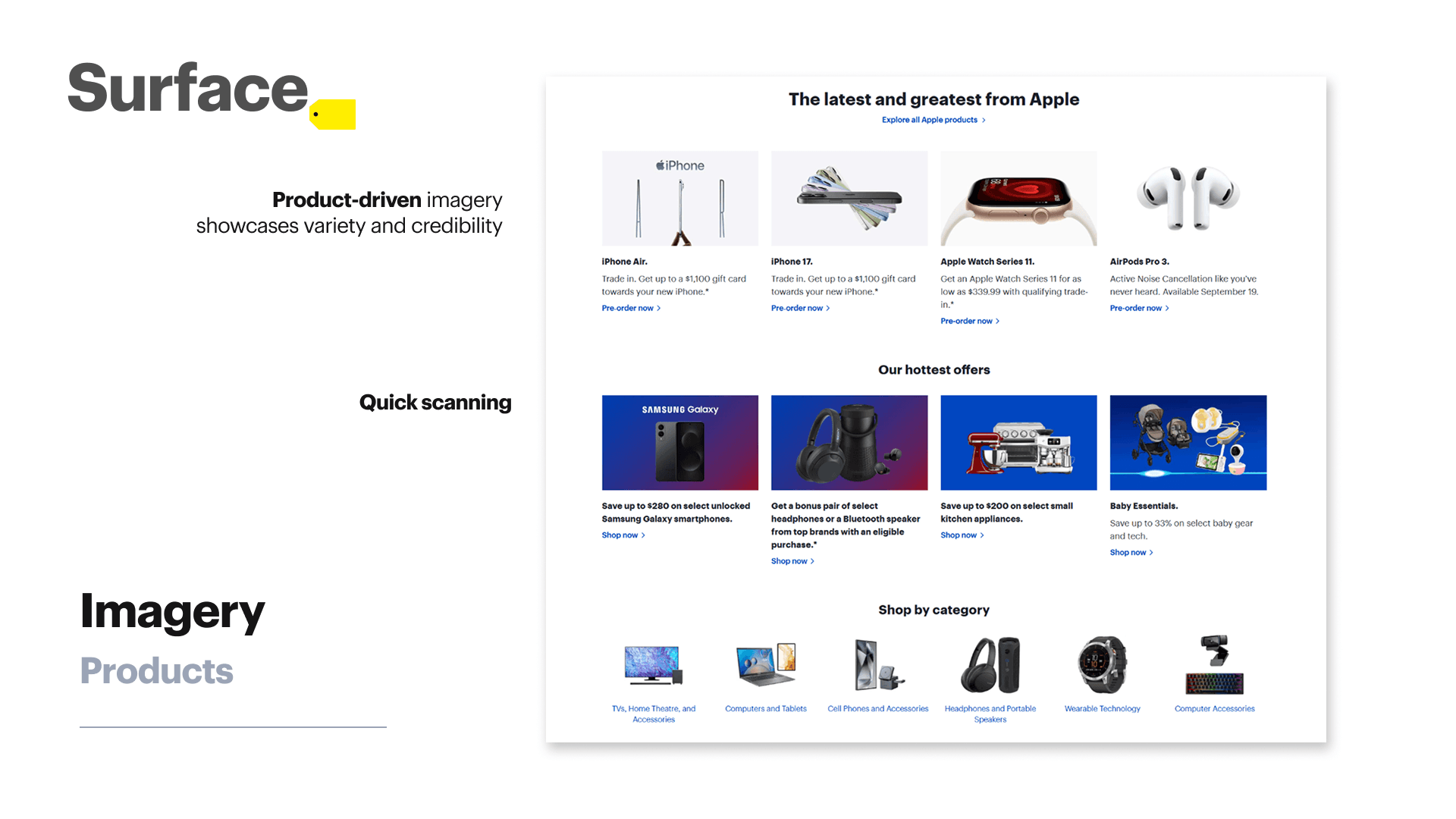 • Best Buy’s homepage relies heavily on product imagery, promotions, and recognizable brand visuals. This supports quick scanning and reinforces credibility.