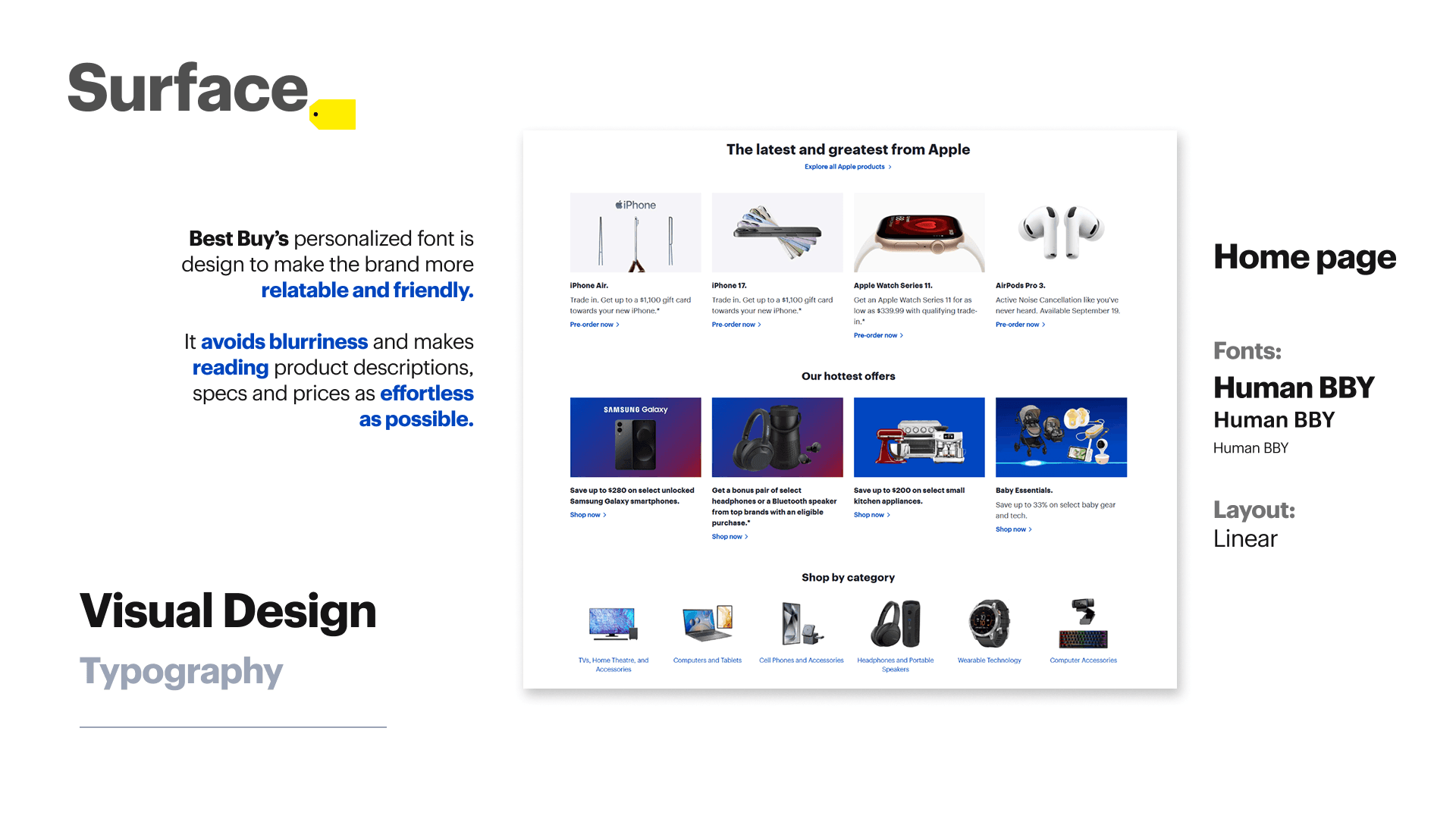 ▸ Best Buy’s visual system uses blue as a dominant color to convey trust, technology, and authority. Yellow accents function as high-visibility action triggers, especially in pricing and promotions.